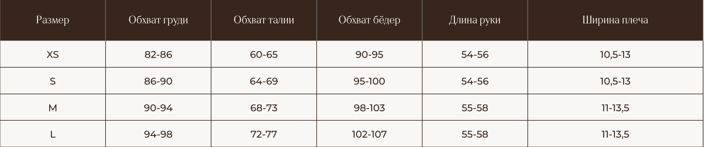 Таблица размеров: